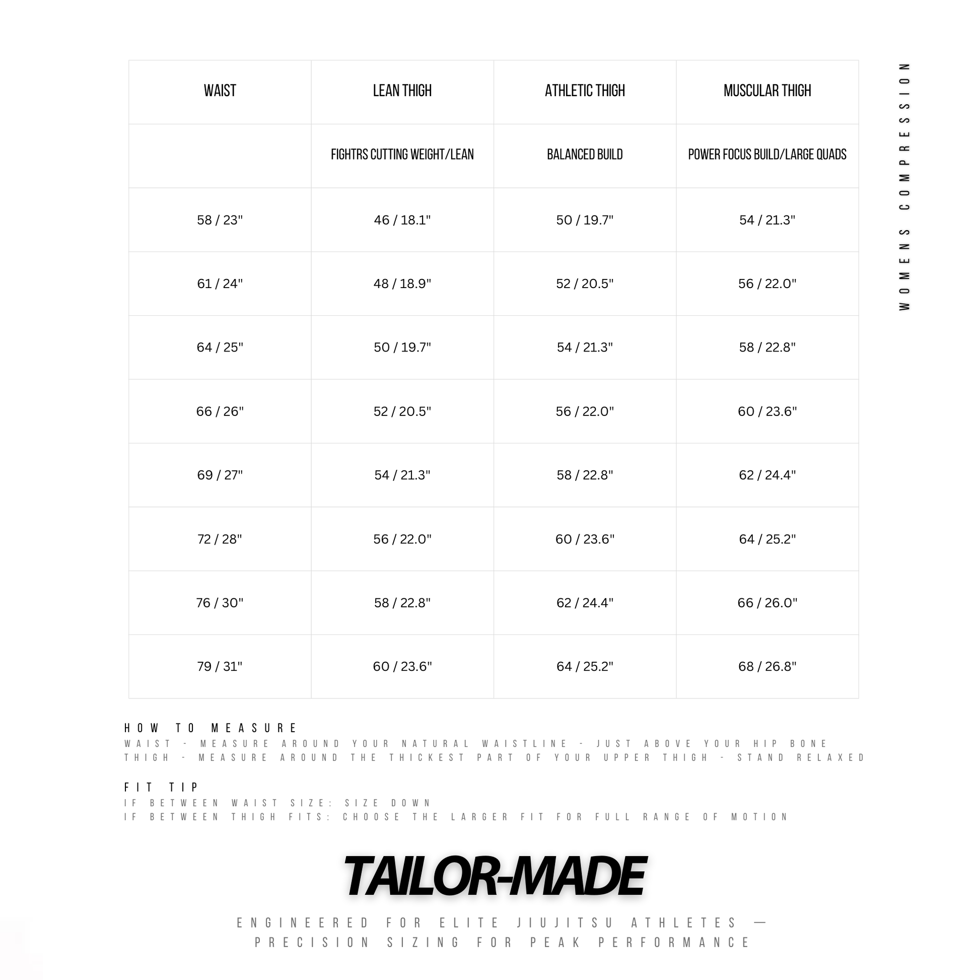 Roshi No-Gi Compression Shorts are designed for professional Jiu-Jitsu athletes who need absolute precision from their gear on competition day. Every pair is constructed with our advanced waist-to-thigh sizing system to deliver a tailored, locked-in fit that won’t shift, sag, or restrict — even under championship-level pressure.
